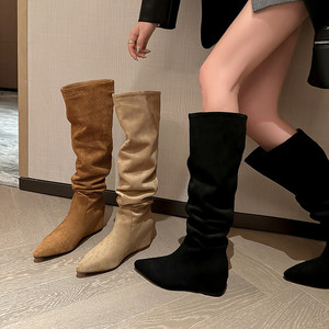 绒面内增高堆堆靴女高筒长靴子冬新款韩版尖头高跟及膝靴女靴单靴