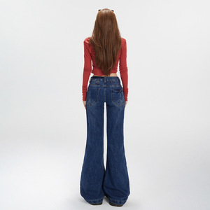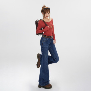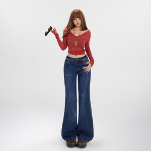 【今茵】美式复古低腰辣妹喇叭裤垂感水洗抓毛百搭显瘦牛仔长裤女