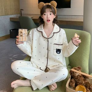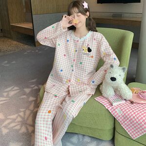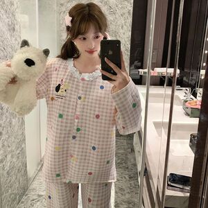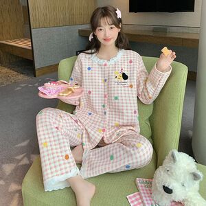 空气棉夹层睡衣女款秋冬季可爱公主风格子花边长袖宽松家居服套装
