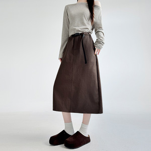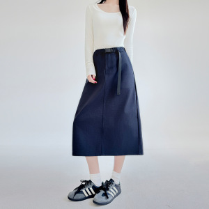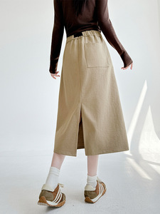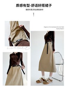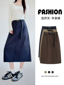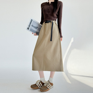 高品质卡其色搭扣腰半身裙女秋季新款显瘦a字裙水洗后开叉工装裙