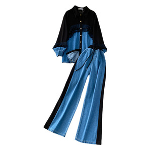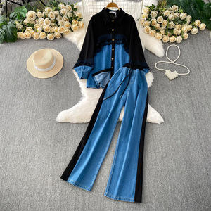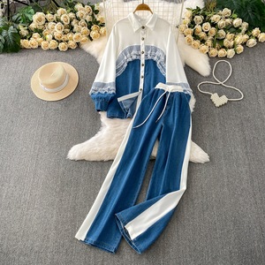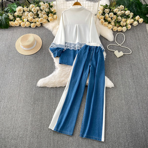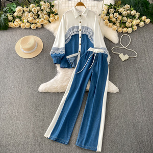 欧美时髦高级感蕾丝拼接牛仔翻领衬衫+休闲高腰显瘦阔腿裤两件套