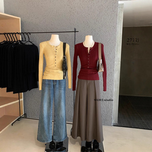 WGWE7199法式简约风时尚单品纯色圆领单排扣长袖修身针织衫