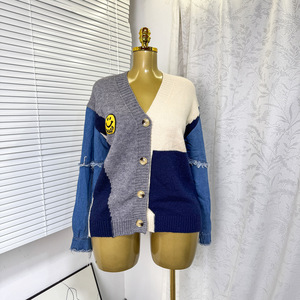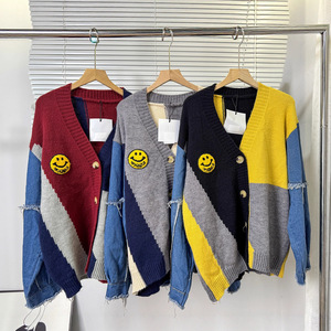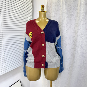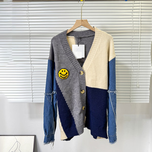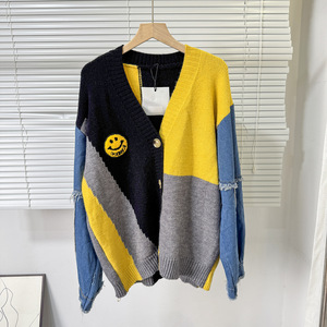 跨境外贸秋冬开衫毛衣女 撞色拼接牛仔袖宽松时尚单排扣百搭外套