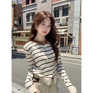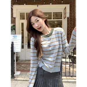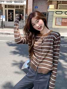 春秋季2025时髦小香风条纹长袖毛衣针织衫女松弛感单排扣外套上衣