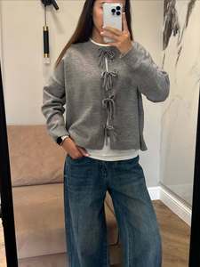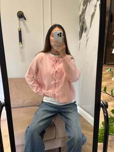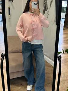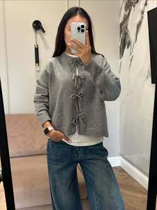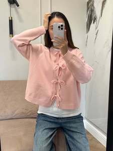 2025年欧美跨境圆领系带针织开衫外套秋冬韩系短款女装蝴蝶结毛衣