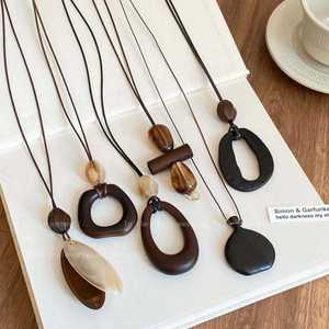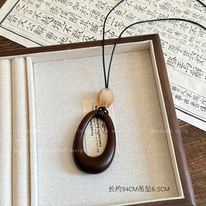 新中式镂空木质圆形吊坠项链女民族风小众设计毛衣链复古挂脖配饰