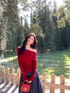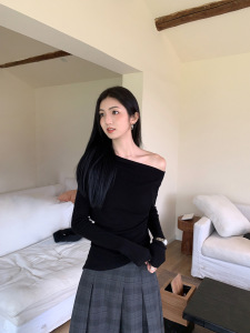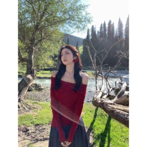 MULVAN 红色斜肩针织衫女高级设计感小众气质修身一字肩长袖上衣