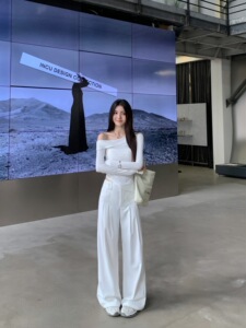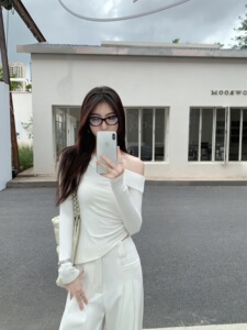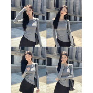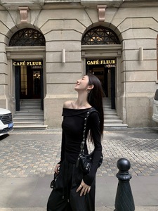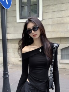 MULVAN 黑色斜露肩长袖T恤女修身不规则设计感小众显瘦针织衫上衣
