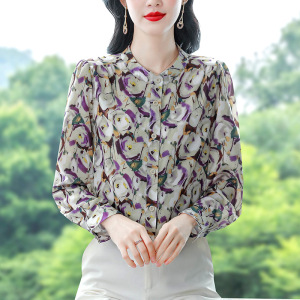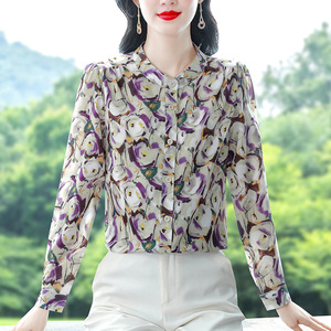 缎面衬衫女秋季立领时髦印花复古独特显瘦休闲雪纺上衣打底衫妈妈