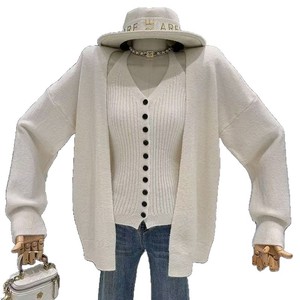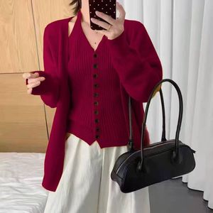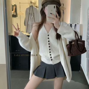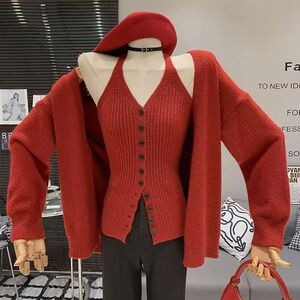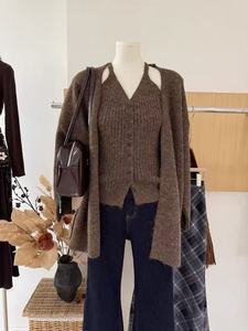 韩系慵懒针织开衫外套挂脖吊带背心两件套秋冬高级感软糯毛衣套装