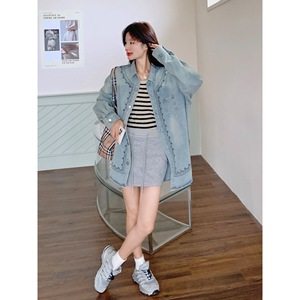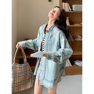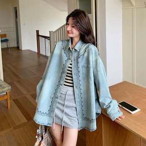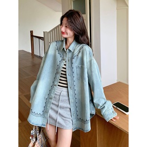 浅蓝色复古印花牛仔外套女2025秋新款设计感宽松休闲百搭衬衫上衣