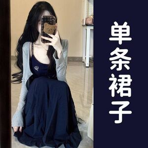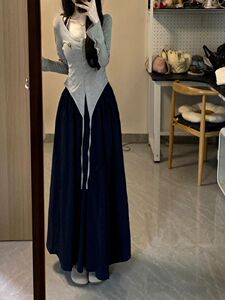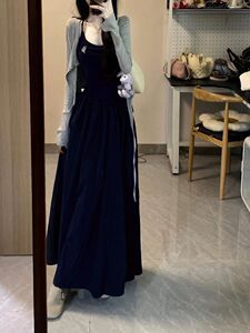 法式赫本风蓝色吊带连衣裙子女秋季2025新款巨好看的掐腰长裙套装