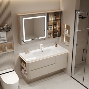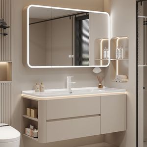 现代卫生间智能实木浴室柜组合简约奶油风洗手台陶瓷一体盆洗脸盆