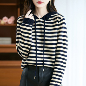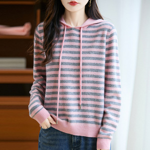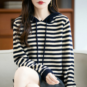 新款纯羊毛衫女连帽条纹针织打底衫新款撞色套头毛衣显瘦女装上衣