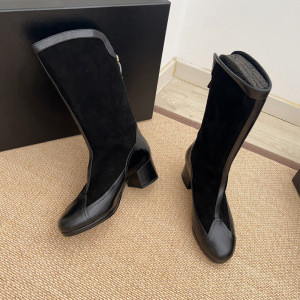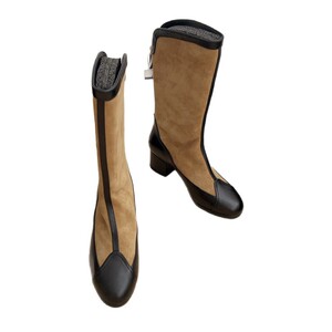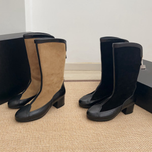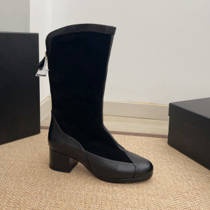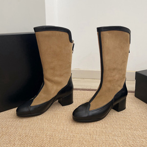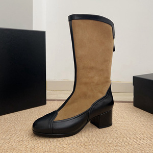 高定东莞货!进口真皮!小香风撞色女长靴粗高跟后拉链西部牛仔靴