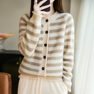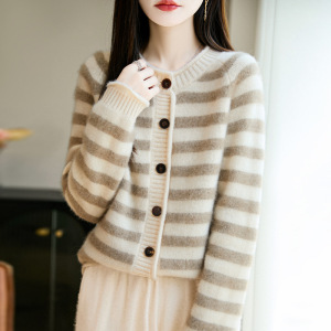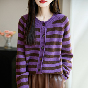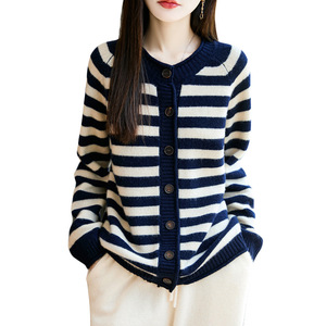 美丽诺100纯羊毛开衫女秋冬新款圆领上衣条纹针织女装毛衣外套