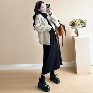 实拍孕妇秋装套装时尚外出长袖开衫裙宽松遮肚孕妇上衣两件套