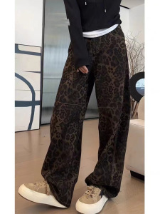 大码美式豹纹直筒牛仔裤女2025秋胖mm宽松显瘦高腰阔腿弯刀裤子