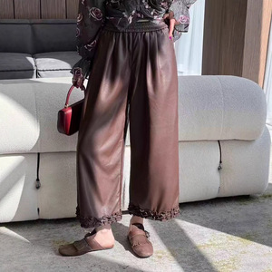 木耳边裤脚pu皮阔腿裤女秋季新款松紧腰显瘦百搭休闲蛋白皮九分裤