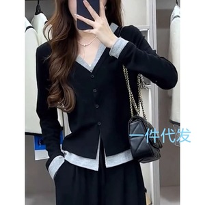 大码假两件拼接长袖T恤女2025秋季新款胖MM显瘦遮肉正肩打底上衣