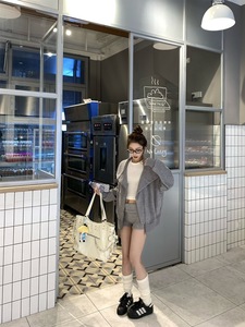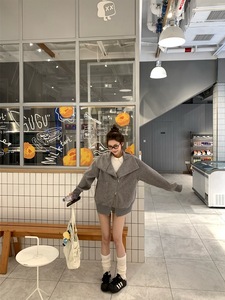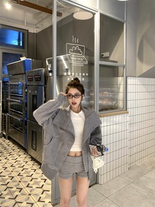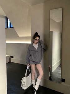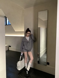 韩系慵懒灰色立领卫衣外套女秋季宽松拉链开衫chic高级感翻领上衣