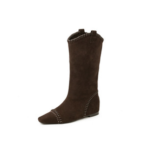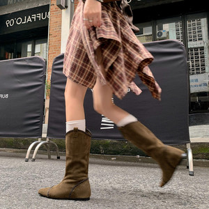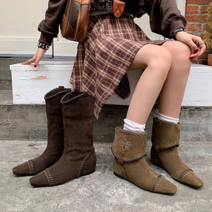 内增高两穿短靴女靴秋冬新款牛翻皮刺绣方头中跟女翻边短筒靴女靴
