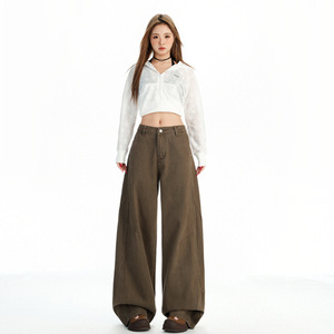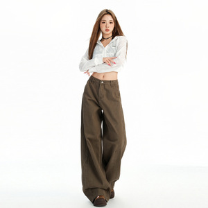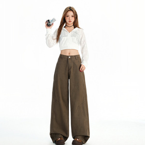 稚橘#复古棕咖水洗做旧阔腿牛仔裤女宽松显瘦遮肉个性百搭直筒裤