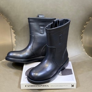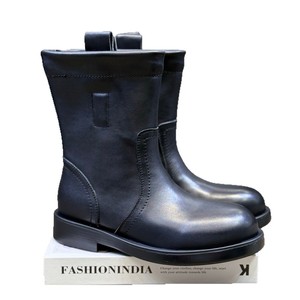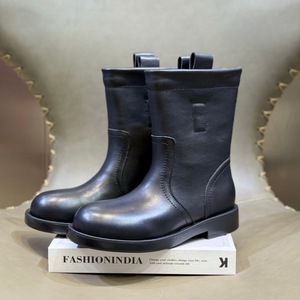 2025新款韩版小众简约圆头真皮一脚蹬骑士靴女中筒机车靴