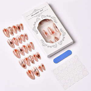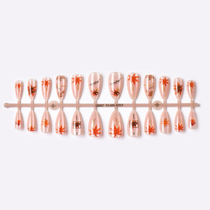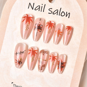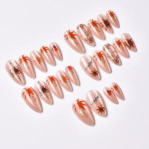 24片跨境秋冬新款杏仁猫眼穿戴甲彩绘鎏金枫叶美甲甲片现货批发