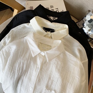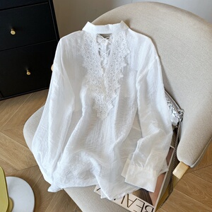 白色蕾丝拼接POLO领长袖衬衫女秋季后背镂空宽松衬衣高级感上衣服