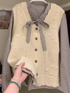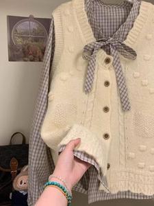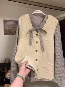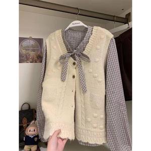 新款2025秋季韩系学院风女生显瘦叠穿杏色针织开衫马甲衬衫两件套