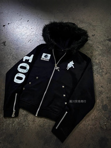 欧美跨境字母印花烫钻连帽卫衣秋冬复古高街嘻哈宽松拉链外套潮