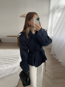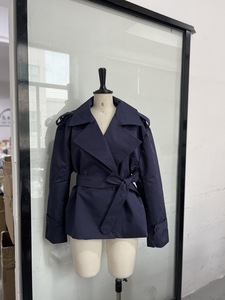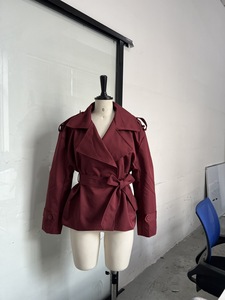 欧美跨境2025秋季纯色系腰带短款夹克翻领宽松收腰系带短风衣外套