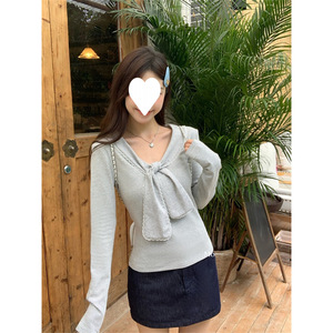 工厂批发韩系条纹蕾丝拼接蝴蝶结长袖T恤女秋季修身打底内搭上衣