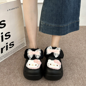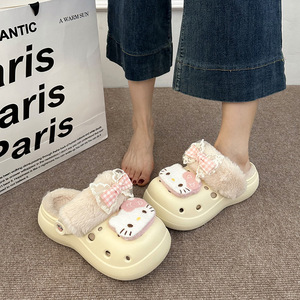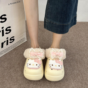 多巴胺甜美蝴蝶结洞洞鞋女2025秋冬季新款可爱乖巧小猫包头棉拖鞋