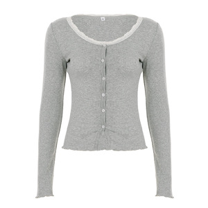 夏季新款蕾丝花边修身显瘦辣妹长袖T恤BM风圆领排扣打底上衣开衫