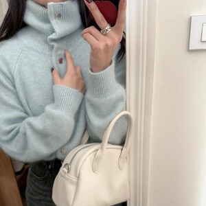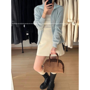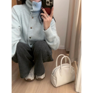 韩系高级感蓝色浣熊绒立领针织开衫女秋冬慵懒风宽松高领毛衣外套