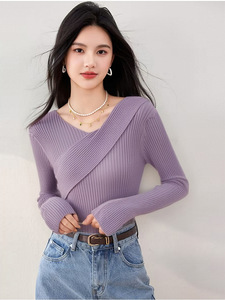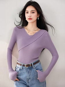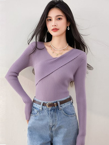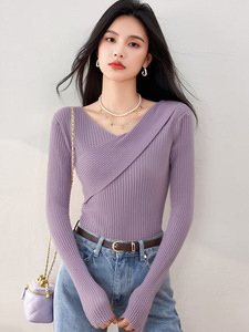 法式紫色交叉v领长袖针织打底衫女秋冬季内搭毛衣设计感短款上衣