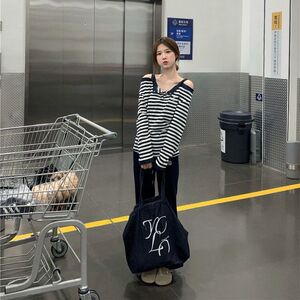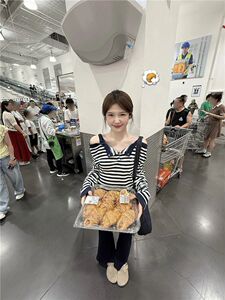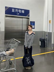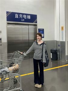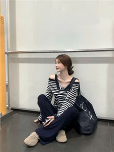 条纹甜辣风一字肩长袖T恤女早秋新款假两件显瘦休闲慵懒风上衣潮