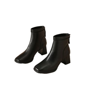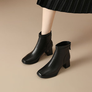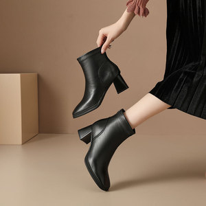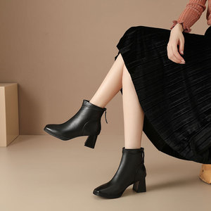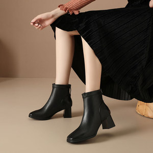 头层牛皮瘦瘦靴巴黎街头粗跟马丁靴女短靴新款法式高跟女鞋皮靴