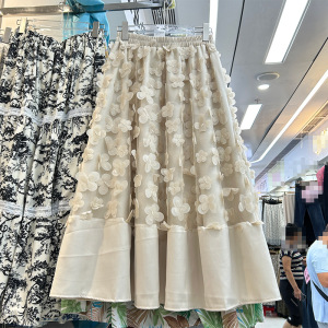 重工立体花朵网纱拼接半身裙女2025秋冬新款A字显瘦大摆伞裙546M