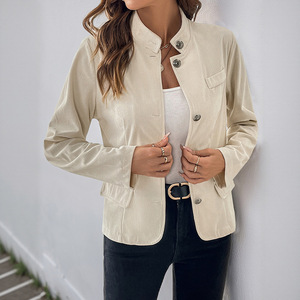 亚马逊外贸2025秋冬新款休闲复古风修身型立领灯芯绒杏色跨境外套