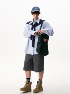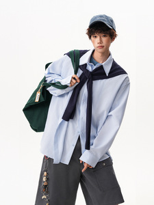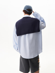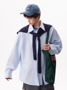可拆卸披肩蓝条纹长袖衬衫男女秋季潮宽松少年感衬衣情侣开衫外套