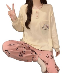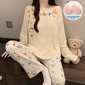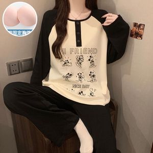 带胸垫睡衣女款春秋季仿棉可爱卡通长袖套装宽松少女家居服可外穿
