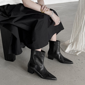 头层牛皮宽筒短靴女单靴秋冬新品真皮尖头粗中跟短靴套筒短靴女靴