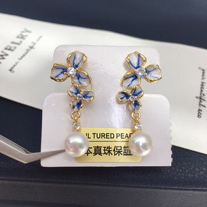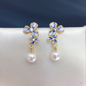 天然淡水珍珠耳钉女青花瓷三瓣花灵动珍珠耳环小清新珍珠首饰批发