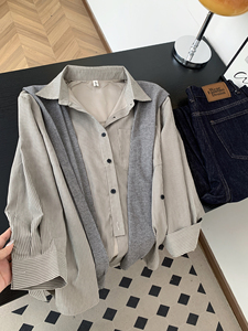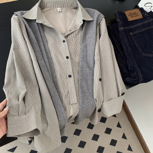 复古松弛感针织披肩条纹长袖衬衫女秋季小众气质宽松休闲翻领上衣