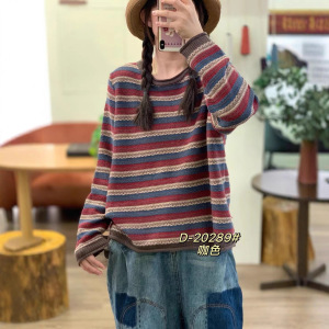 新款文艺百搭彩线条纹圆领棉线针织衫女套头毛衣