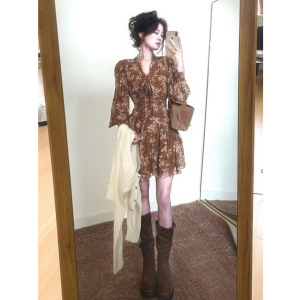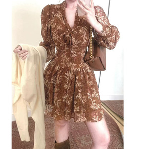 茶歇法式气质老钱风碎花连衣裙子女夏季2025新款长袖雪纺收腰短裙