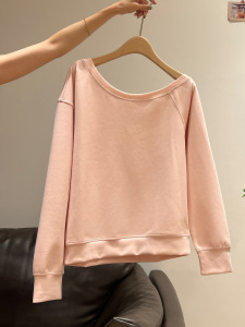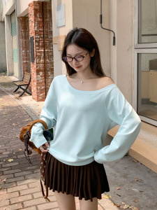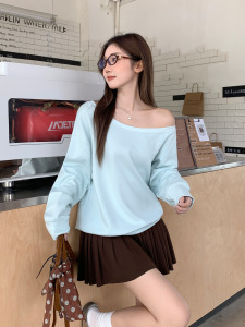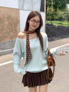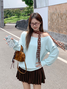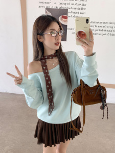 浅绿色斜肩露肩波点丝巾长袖卫衣女2025秋季新款慵懒风松弛感上衣